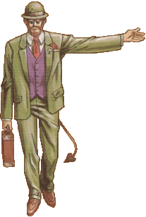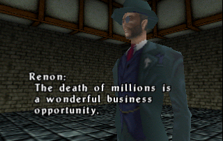 Renon, his pointy tail hardly concealed, was always one to capitalize on Armageddon, and he was more than happy to assist the living if it would mean gleefully watching their demise at a later time. After all, the deaths of millions was a wonderful business opportunity. In a gentlemanly manor, Renon offered his services to the hero if he were to sign the contract; therein, he'd supply Reinhardt all types of helpful items to take along on his quest. Furthermore, Renon promised to come to Reinhardt's aid any time he found another of his contracts laying about. He did this job well until Reinhardt neared the castle keep, whence he felt that his services were no longer needed. He bid the hero farewell and returned to Hell to find his next client. Note that the story changes if while playing Castlevania 64 you spend too much money. As the story unfolds from this alternate perspective: Renon revealed that there was a clause in the contract, fine print that Reinhardt failed to consider. He spent too much money on goods, greedily, and would have to pay the price with his soul. Renon thus revealed his true identity, a formidable hellspawn, and tried to make good on the proposition. Instead, Reinhardt rendered the contract null and void, and Renon was unceremoniously shipped back to Hell. |