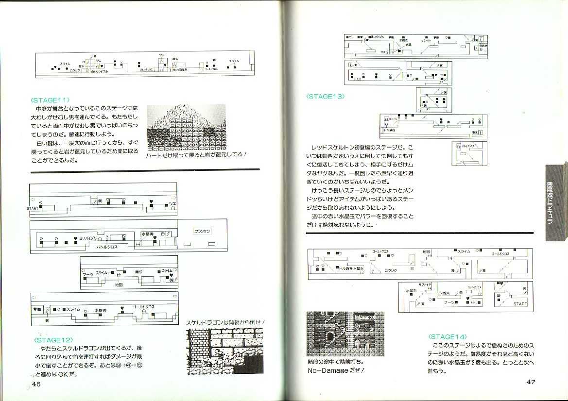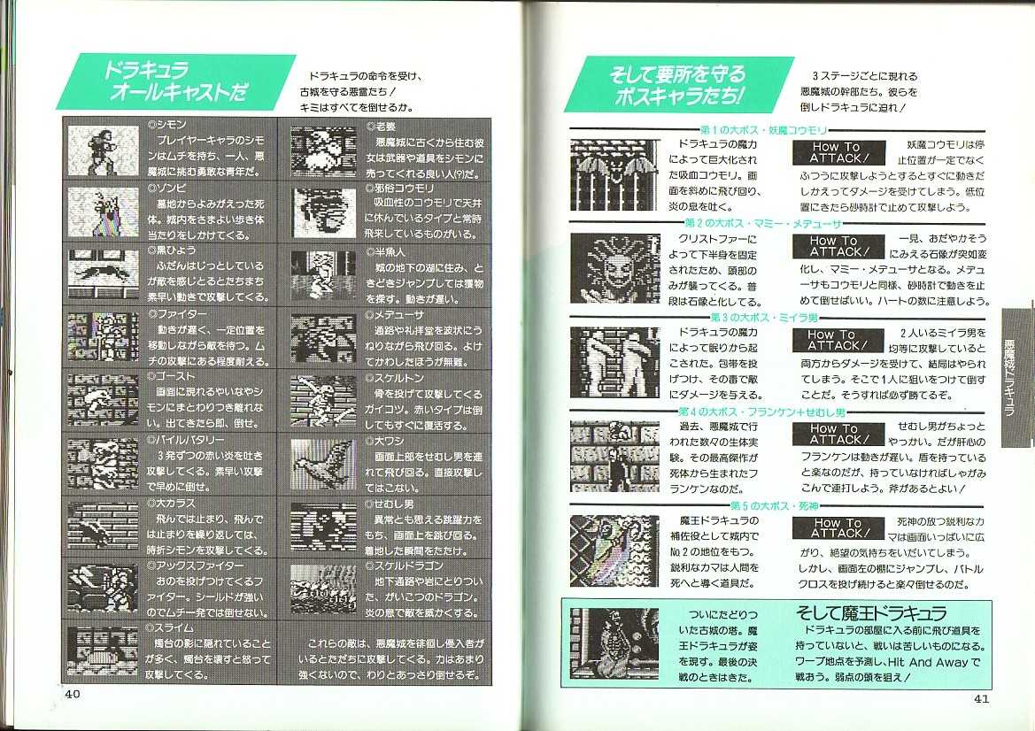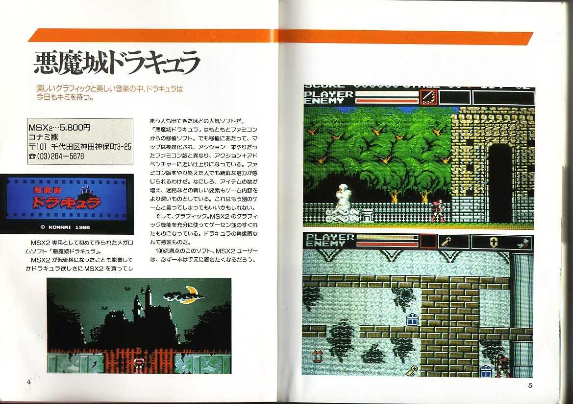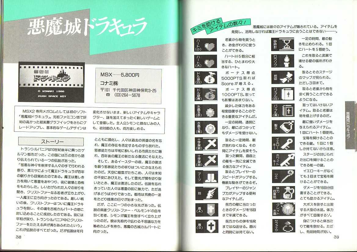 The Japanese item is the MSX & MSX2 MEGA-ROM Guide Book , which features guides for the computer systems' game titles multi-page walkthroughs. Covered in this particular guide is Akumajou Dracula (or Vampire Killer, for those confused by the reused title); in terms of style, the pages are mostly black and white. (All images have been contributed by Luv.)