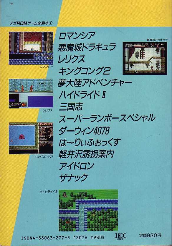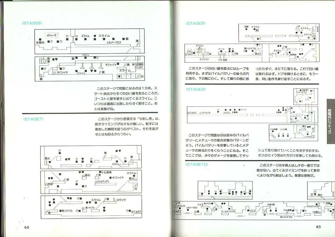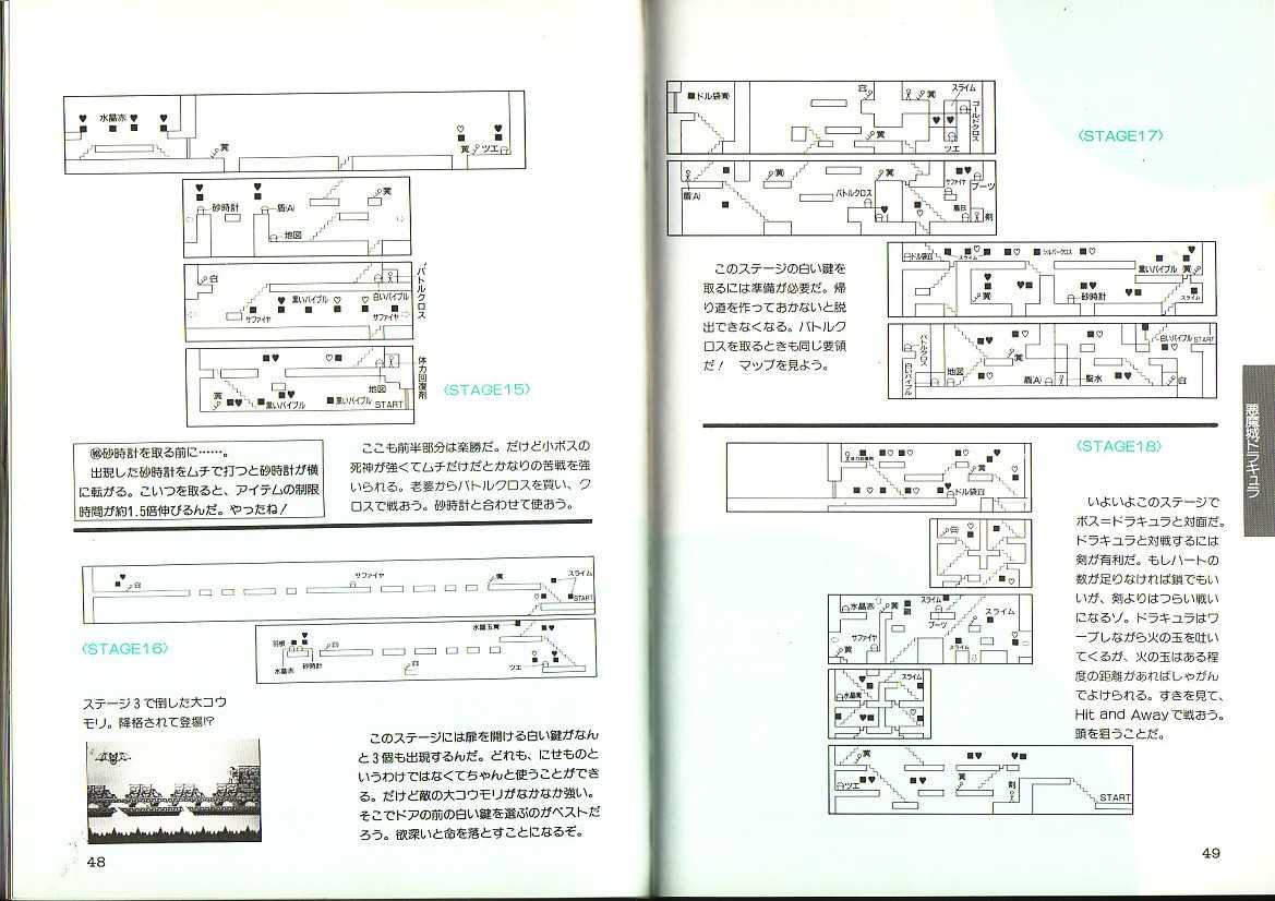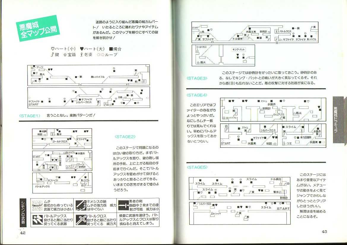 The Japanese item is the MSX & MSX2 MEGA-ROM Guide Book , which features guides for the computer systems' game titles multi-page walkthroughs. Covered in this particular guide is Akumajou Dracula (or Vampire Killer, for those confused by the reused title); in terms of style, the pages are mostly black and white. (All images have been contributed by Luv.)