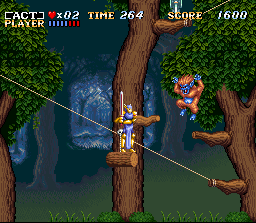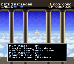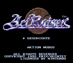 Actraiser has two seperate parts: City building/simulation mode, and action mode. The former involves visiting the different cities on your planet, listening to the needs of the people, and acting accordingly. This may involve getting rid of monsters flying around, using lightning to clear land for city development, or creating rain in the desert so that the people there can grow crops. The other half, action, is a good old-fashioned 2D platformer. You assume a physical form on the planet's surface and use your sword and some magic power to eliminate monsters and their bosses. One notable change in the European versions of Actraiser that wasn't in the US or Japanese versions is the ability to choose between the full game of simulation and action, or a more traditional game consisting of just the action levels.