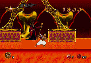 A simple platform game with elements of hack'em up - Aladdin can use a sword against his enemies. Of course when you cut them you won't see any blood but they'll disappear with a puff! He can also throw apples. The control system is responsive. There are about 10 levels total, including Agrabah Market, the Sultan's Palace, the Cave of Wonders, the Desert, the Palace's Dungeons and Jaffar's Palace. In some levels there are bosses. At the end you fight Jaffar. The game is a bit easy, but there are some tricky parts.