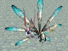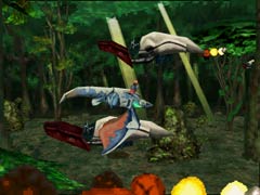 Now, tell me that isn't cool. The first thing I noticed about Panzer Dragoon Zwei in-game were the graphics. To put this into perspective, the game came out a full year before we got anything even remotely as good on the PlayStation, and with positively burning 3d characters and environments! Not only does the game run at a much smoother rate (30 fps +), the animation is fluid and life-like (as Lagi jaunts along), and the world is just so much more realized. Its not that there is a significant increase in the number of polygons being displayed, but they are used much more efficiently when compared to Ein. The distracting pop-up of the first game is nothing more than a distant memory; the textures are very detailed, possessing a delicate painterly quality (with much attention lavished on lighting; something almost completely unheard of for its time). Rounding out the graphical features are the best water effects of its generation, continuing the high standards of the original. The targetting control is much improved, and they added a berserk meter which slowly fills up as you play, upon release causing massive solarized damage to whatever you target. On top of that, in many of the levels you can head left or right for two totally different areas. And last but not least after almost every episode, your dragon, Lagi, evolves from the flightless glider (similar to a Horse-claw or Chocobo) until finally becoming this majestic, armored, flying terror (a terror under YOUR control!), based on how well you did during the mission. Also added is a handy save feature, but removed is the mostly useless ability from the first game to change camera distance (there's simply too much shooting action going on to make use of it anyway!).