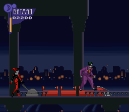 ![]() SOUND: As in Batman Returns, the sound is superb as well. The Batman Theme is still present in the music department, but the rest of the music has a more 'happy' feel compared to the gloom present in Batman Returns. That's a drawback, in my opinion, but the music tracks are fun to listen while playing. The SFX are good and do their job fine. Joker's voice, on the other hand, is stupid. GAMEPLAY: Simple and fun. It has elements of Beat'em ups but most of the game is platform. Batman can kick and punch his enemies, as well as perform a body slam. There are also a fair amount of weapons to use such the grappling hook, bombs and tear gas. The play control to perform these moves is excellent. There are 8 levels total, and at the end of most levels there is a villain as the boss. You will face classic villains like the Joker, Poison Ivy, The Penguin, Catwoman and Scarecrow. There is also Two-Face, which is the disappointing batmobile stage's boss, and the Riddler, but unfortunately you don't get to fight him face to face as a boss. The difficulty is pretty high, but there is a password feature that makes the game easier. If you want to see the true ending, though, you must finish the game in hard mode where there are no passwords. That's a challenge for you!
