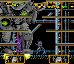 ![]() A side-scroller that would like to be perceived as a platform game. I say that because the control response is very poor and the game is unfair with you when you lose a life (you go back at the beginning). Batman supposedly can jump and shoot his enemies. There are, of course, none of the gadgets like the grappling hook and batarangs. Also if you expect a Batmobile stage, just don't...There are about 12 levels total if I remember right... The first is pretty good (the cathedral) but the rest have nothing to do with Batman. A tank base, a train, some futuristic factories etc...Poor stuff. At the end of each level you face a boss. The bosses are very poor visually and very tough to beat. In the end you face the Joker in a huge robot! There are also some side-scrolling shooter levels a-la R-Type where you control Batman's flying cycle. Why on earth they didn't put at least Batmobile? In these levels the control is better than the action levels but they are too tough as well. There is a password feature but it doesn't save the day. All in all, the game plays like hell...