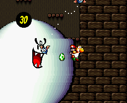 The very first thing you notice upon starting this game is the breathtaking graphics. Yoshi's Island really pushes the SNES to it's limits. The hand drawn look and vibrant colors really set this game apart from other platformers. From the front layers (seeing a Butterfly up close), to the back layers (huge sprawling landscapes), to the massive Super-FX enhanced bosses. It's truly a sight to behold. Besides the graphics being near revolutionary, there was also the game play that had a drastic change. Gone is the one or two hits and you're dead style and the clock, in it's place is something a tad more complicated. Throughout the game, Yoshi has to carry, and protect, baby Mario on his back. If Yoshi were to get hit by an enemy, then baby Mario would be launched into the air, causing a timer to come up. If Yoshi doesn't get Mario back in time, Kamek's henchmen will seize him, thus you will lose a life. To help things out, Yoshi has got some new tricks. First off, enemies you swallow now become eggs. Eggs can be used to knock out enemies, catch coins and flowers, or activate switches. Another usefull skill is the ground pound, needed mostly for finding obscure coins and such.